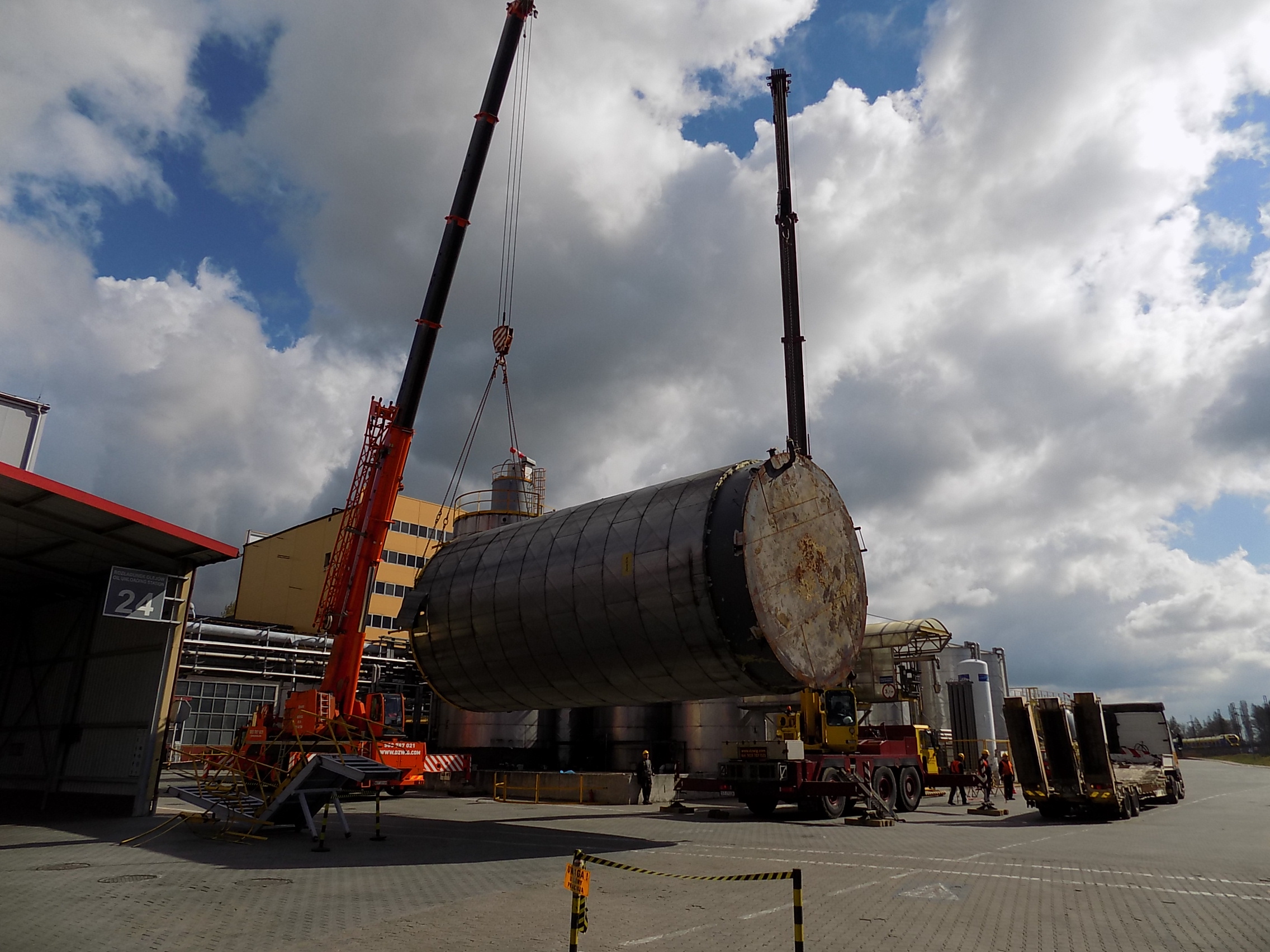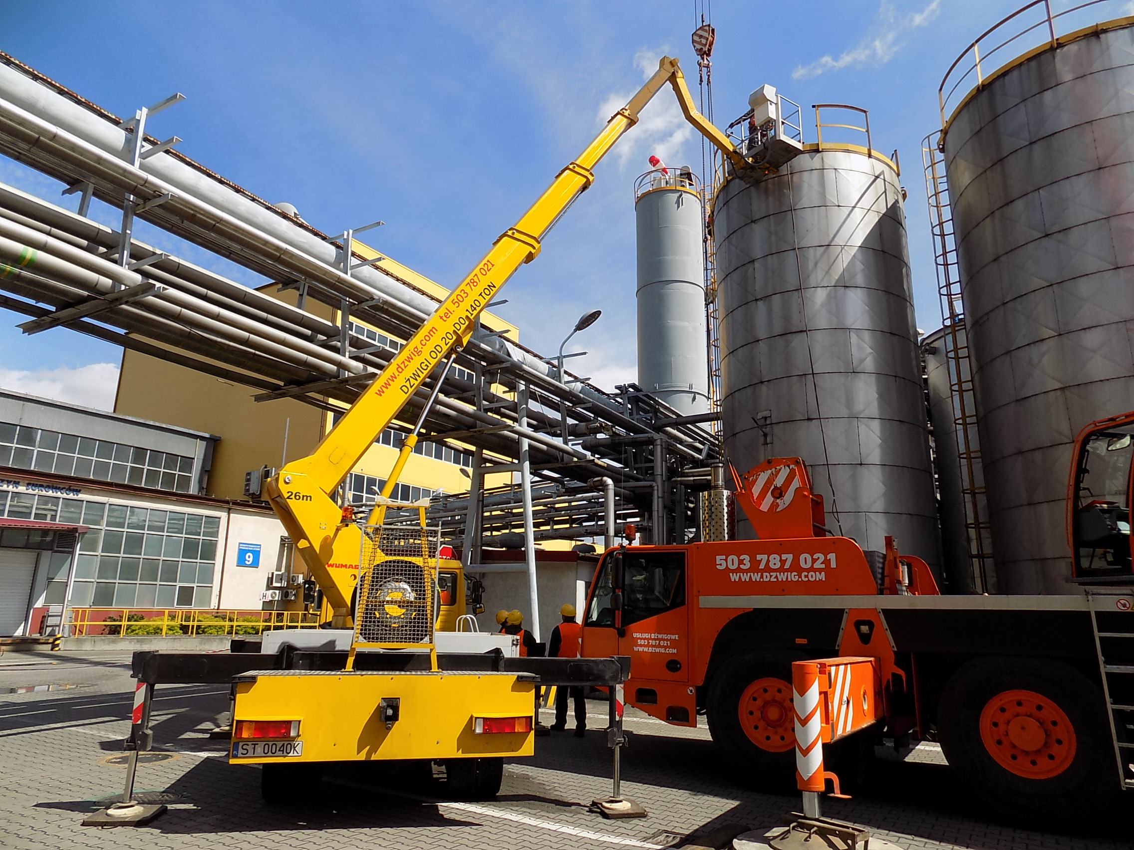 Żurawie samojezdne Demag AC 120-1 o udźwigu 140 ton, Liebherr LTM 1040/1 o udźwigu 40 ton oraz podnośnik koszowy Wumag WT260 podczas demontażu zbiorników na olej.